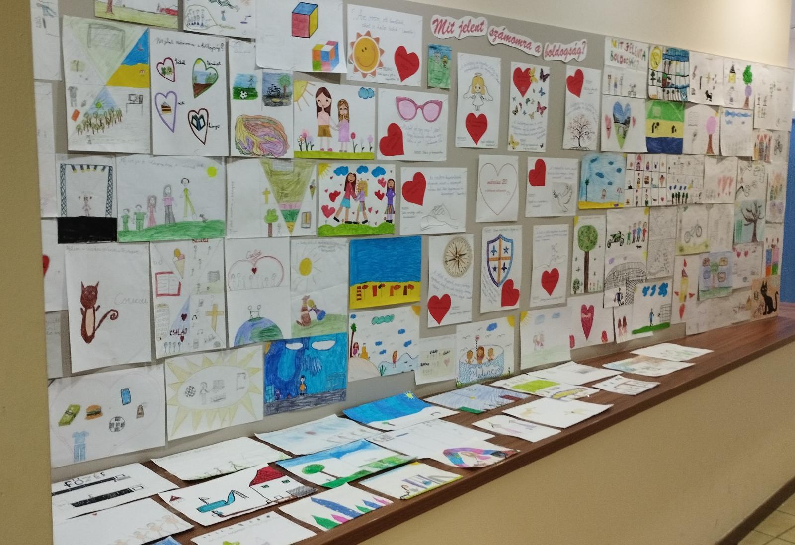 Felhívásunkra az iskola minden tanulója lerajzolta, hogy mi az, ami boldoggá teszi az életét. Így született meg gyönyörű közös alkotásunk a suli galériájában.
