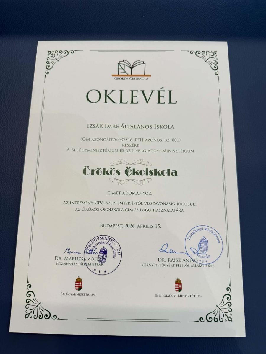 A Belügyminisztérium és az Energiaügyi Minisztérium Örökös Ökoiskolai címmel ismerte el a Biróné Györkös Lívia által vezetett természettudományos munkaközösség munkáját, mely cím használatára intézményünk ezután határozatlan ideig jogosult. Köszönjük kollégáink példamutató munkáját!